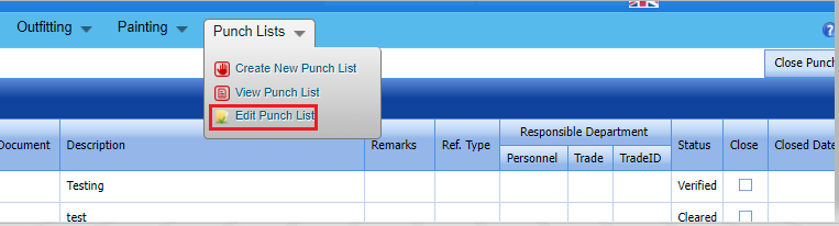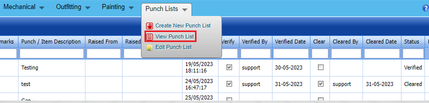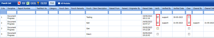 Note: If you want to verify the added punch list item, click the checkbox provided in the Verify column. If you want to clear the added punch list item, click the checkbox provided in the Clear column.