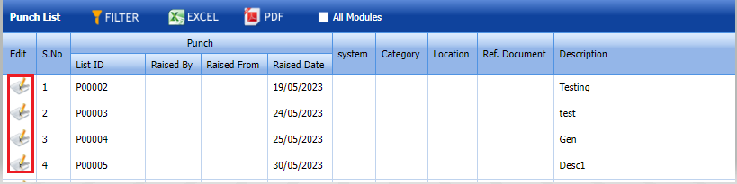 (edit icon) in the Edit column for the respective punch list.. Edit the details in the respective box you want.