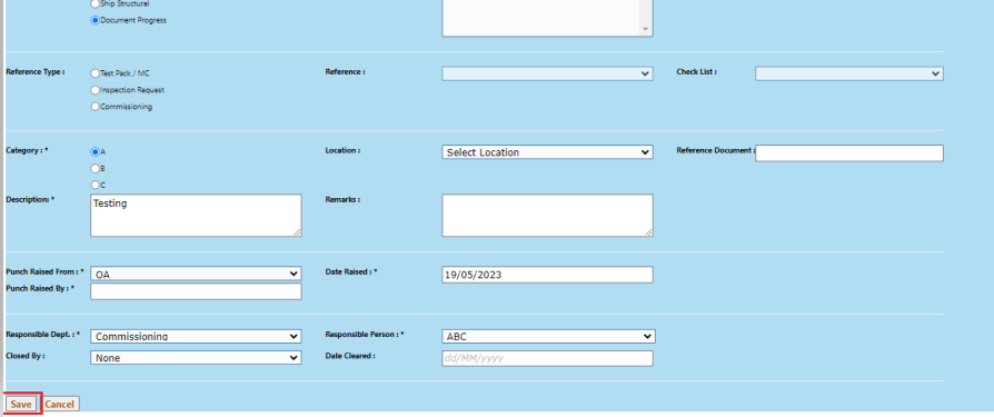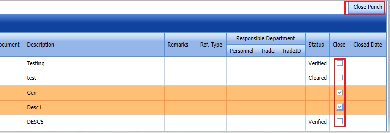 - If you want to close the added punch list item, click the checkbox provided in the Close column.
