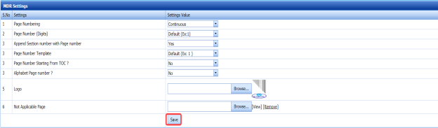 The MDR Settings tab in the Documentation menu helps you to do page setup for the pdf file which will be shown after combining the attached files.