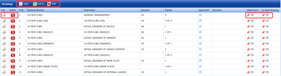 If you want to attach a file with any pressure vessel built drawing listed in the Drawings page, you can use