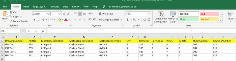 (Upload button) to export the bill of materials details that are included in the excel worksheet.