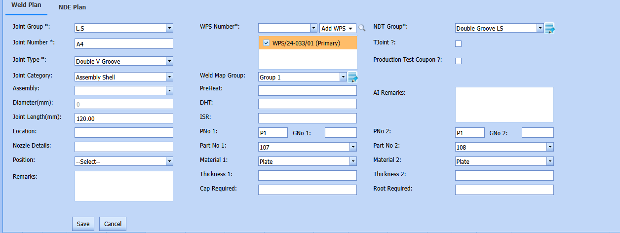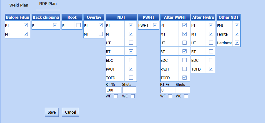 17. Select the NDE Plan Tab and if required change the NDT to be performed in the Before Fit up, Back Chipping, Before PWHT, PWHT, and Other NDT fields.