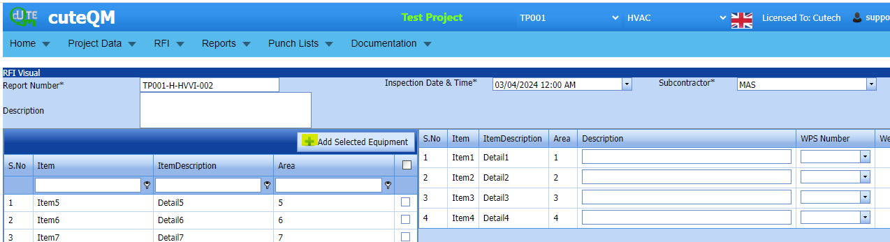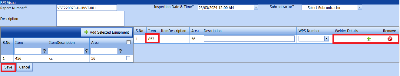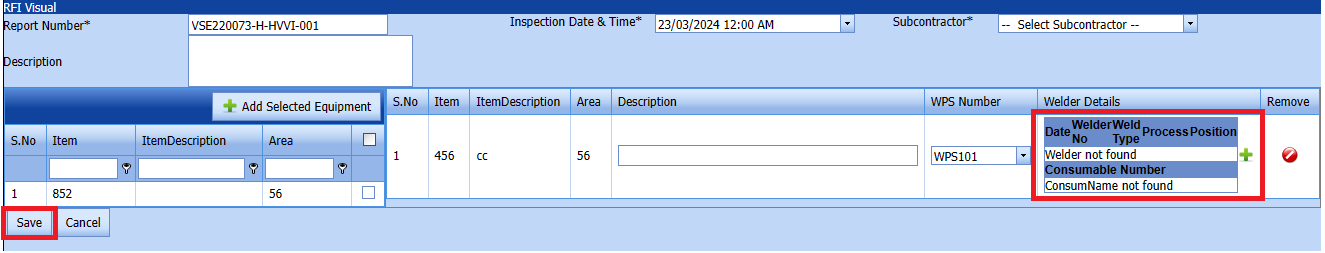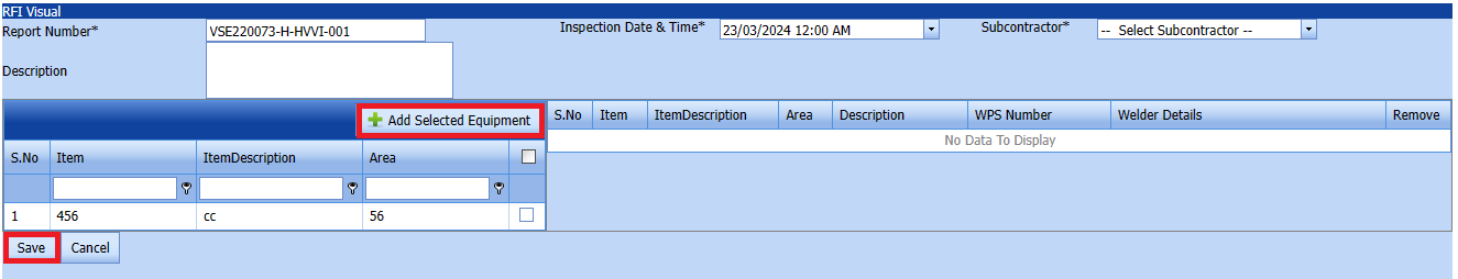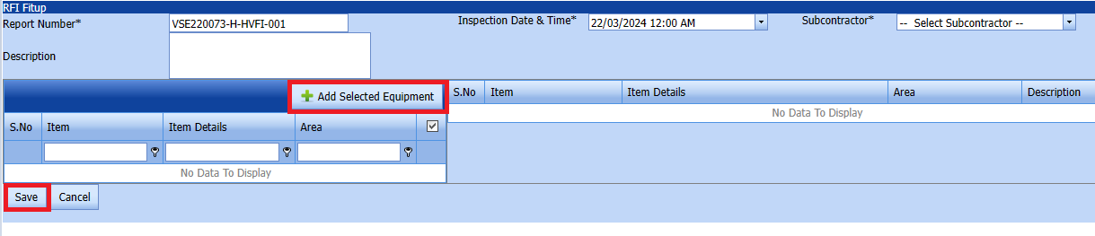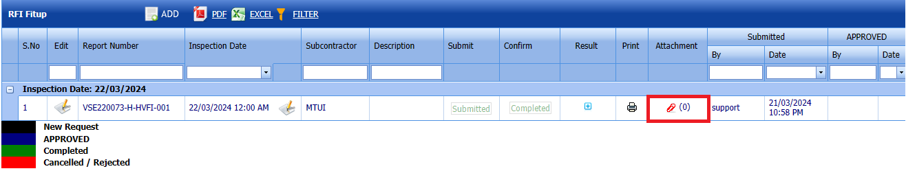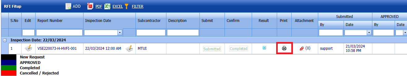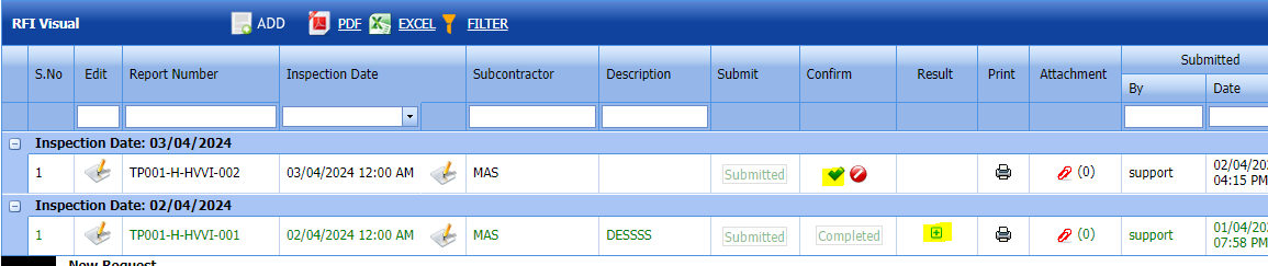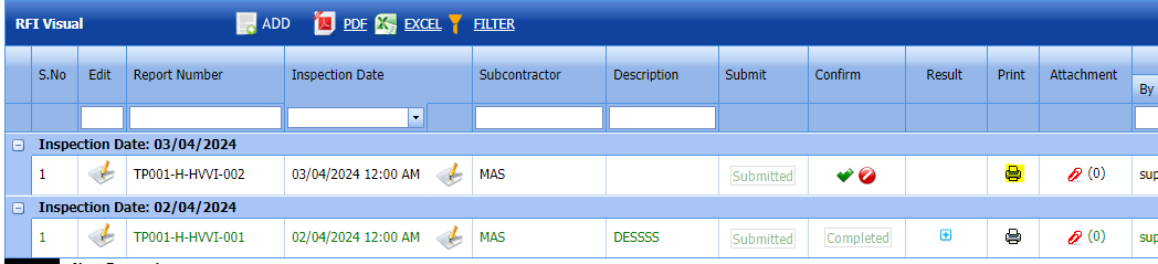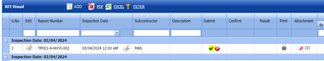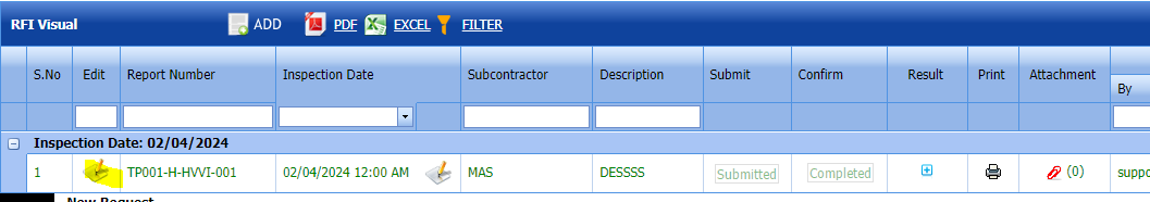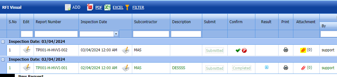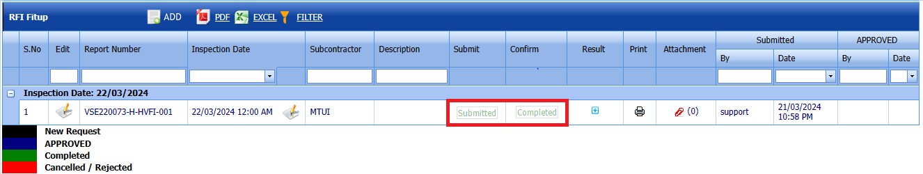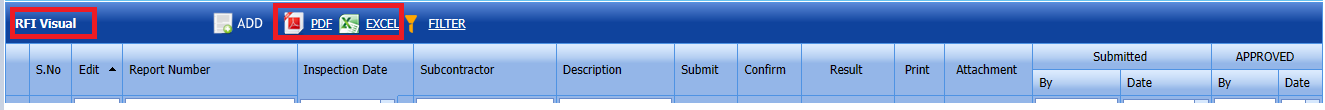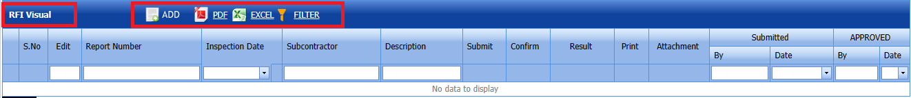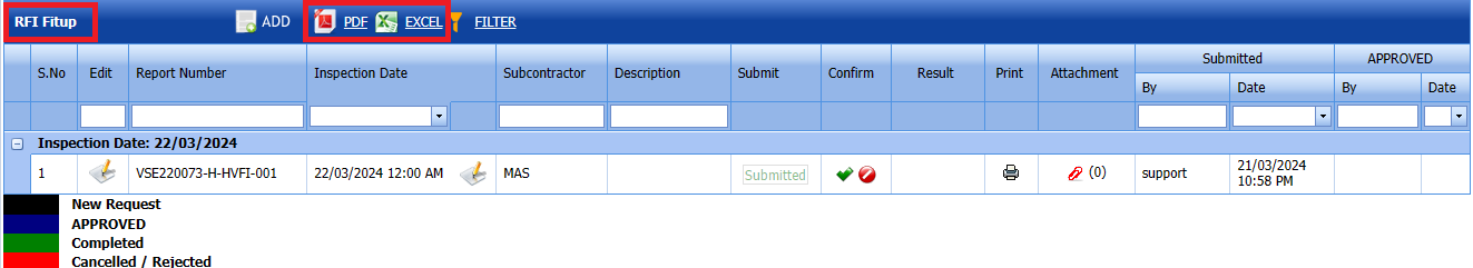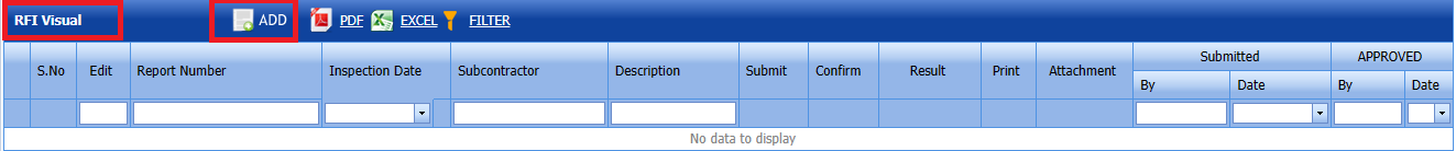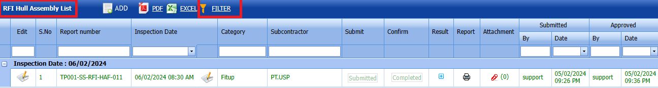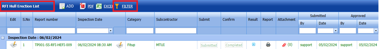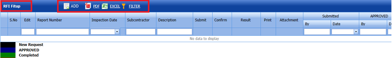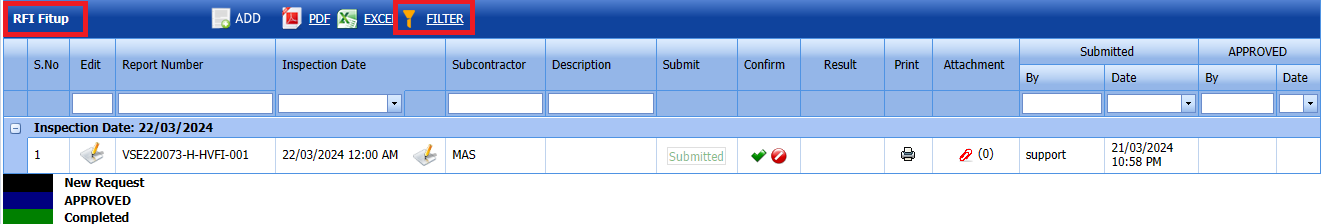 - you can use the filter box provided in the upper side of the RFI Fit up to filter the any specific RFI Fit up and request, select the Report Number, Inspection Date, Subcontractor and Date in the boxes and click.