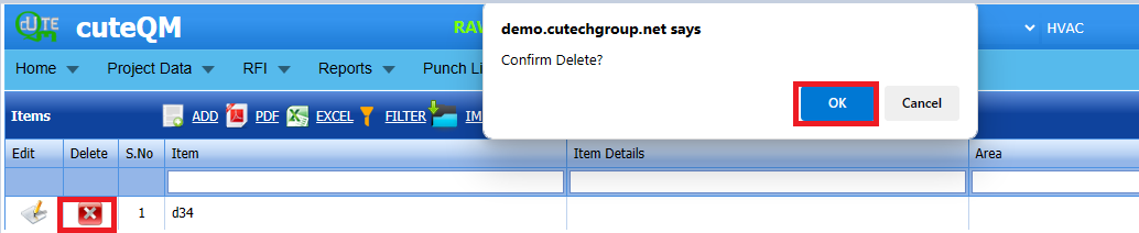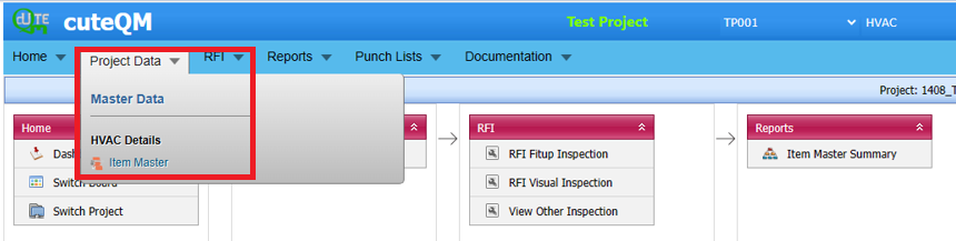 The HVAC Switchboard menu in the cuteQM app helps you to add the Item master. Once you click the project data menu, the following tabs open Item Master