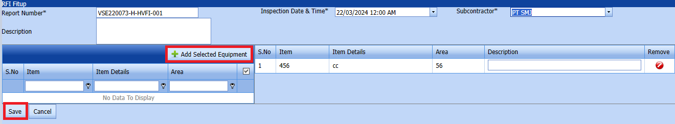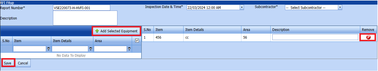 (Remove icon) of the respective item. - In the Description box, enter the description for the added RFI Fit up request.