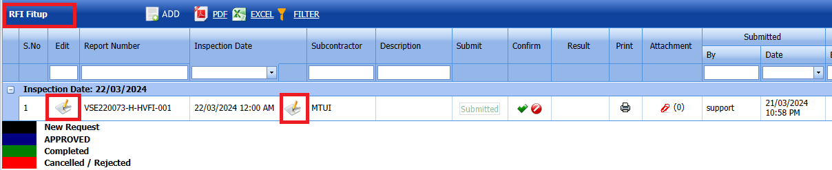Click (Edit icon) in the Edit column for the respective RFI Fit up. See Fig 2.1.2