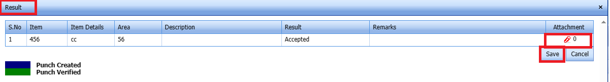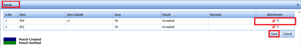 - If need to upload documents against item part, then click attachment icon at the result popup and upload documents.