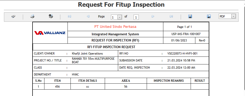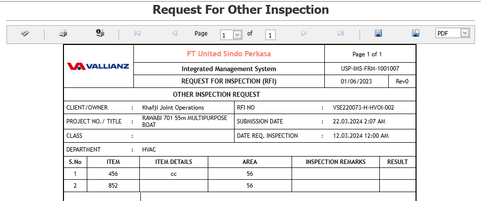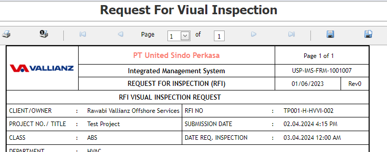 Fig 2.2.5 Print a RFI Visual Inspection Page.