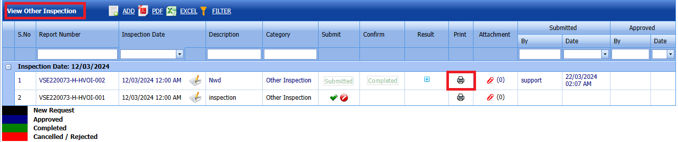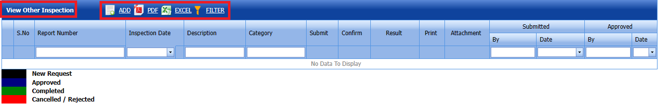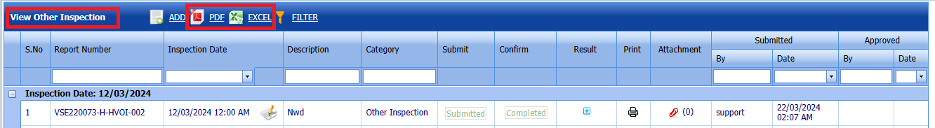 You can export a list of view other inspection requests added in the View Other Inspection page in both the pdf and excel formats by using