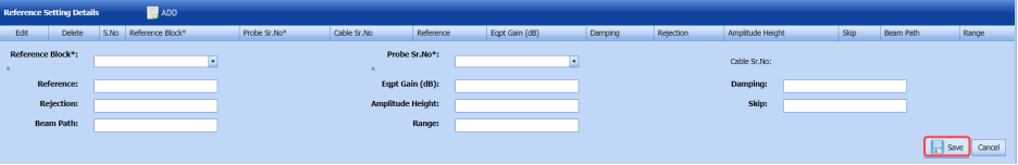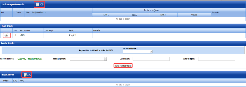 (ADD button) and add the ferrite inspection details.