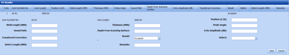 10. In the UT Results window, enter the UT result details.