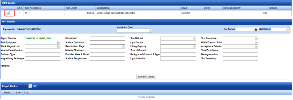 The MT Report tab in the NDT menu used to add the MT inspection result for the added request.