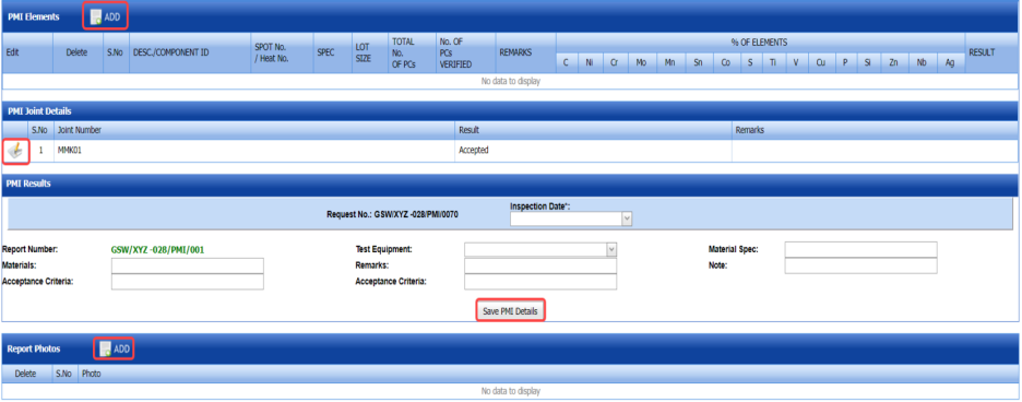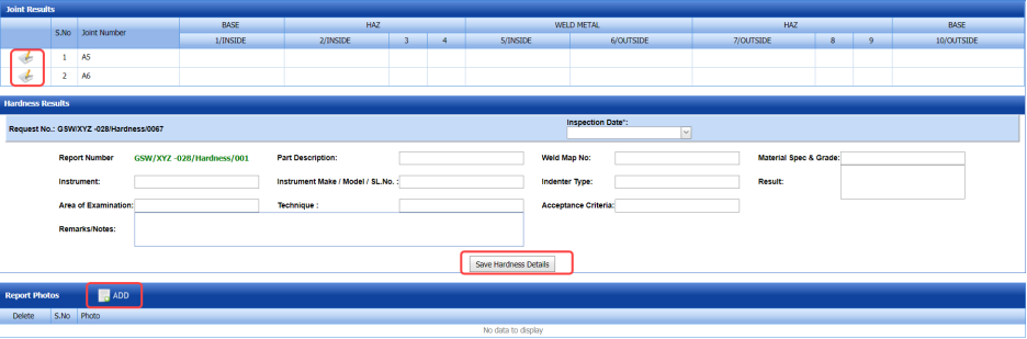 If you have chosen the NDT request type as Hardness while adding NDT request in the NDT Request – RFI tab, the hardness inspection request will be added here.