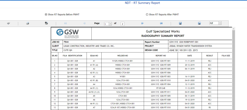If you want to view the RT inspection report, click