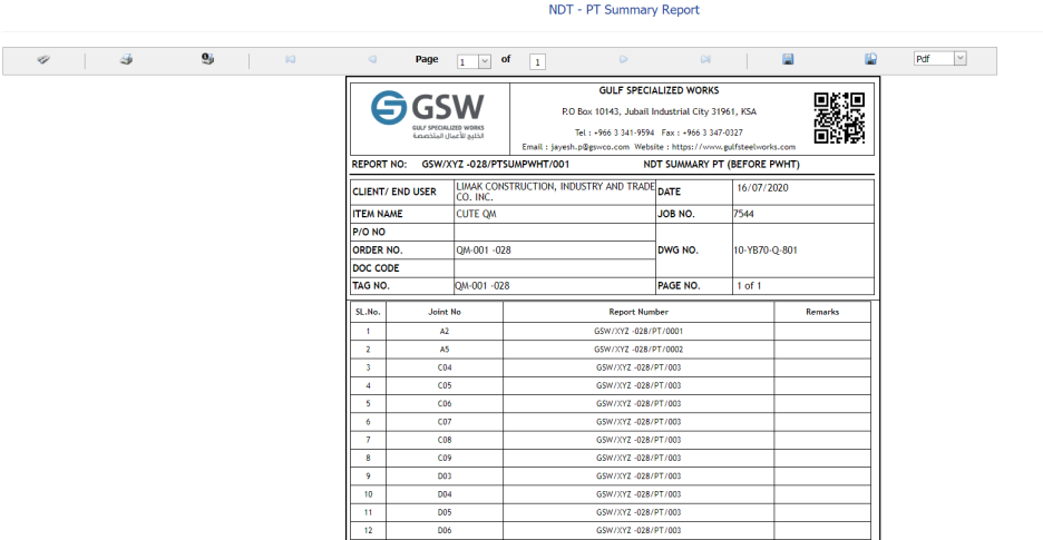 The NDT – PT Summary Report page opens.