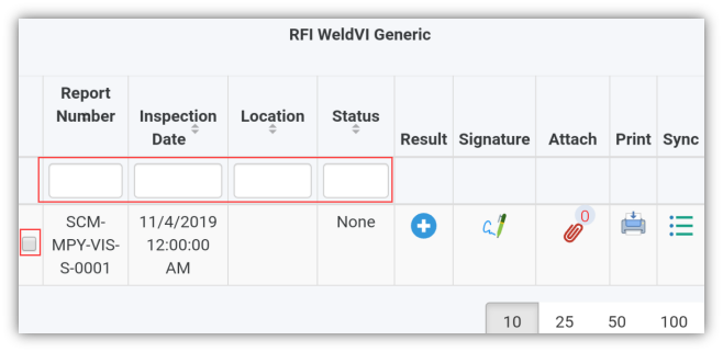 - If you want to filter one report among the list of reports, you must enter the report number, inspection date, location or status details in the respective boxes given in the RFI WeldVI Genericpage.