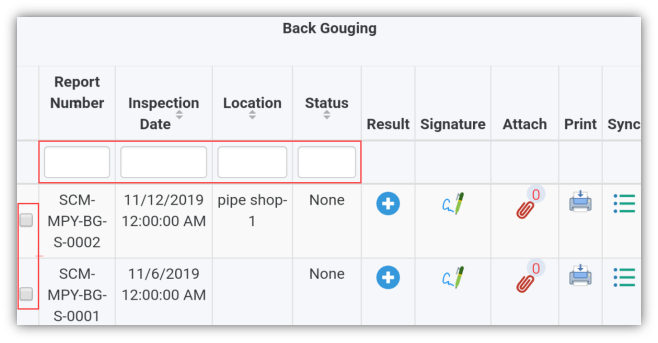 - If you want to filter one report among the list of reports, you must enter the report number, inspection date, location or status details in the respective boxes given in the Back Gougingpage.