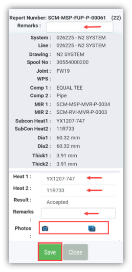 3. Check and reenter the heat numbers of the respective report where you want to add your inspection details.