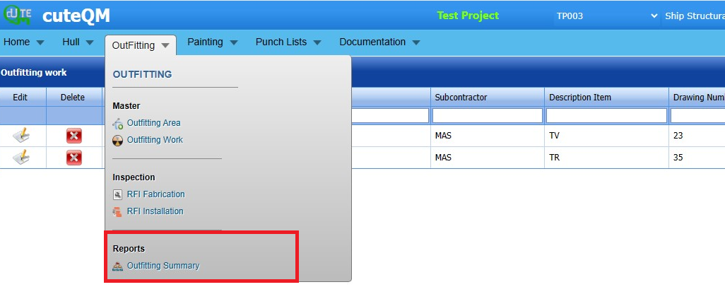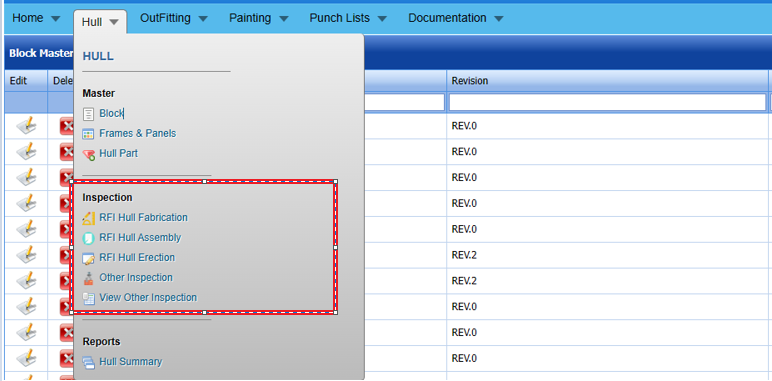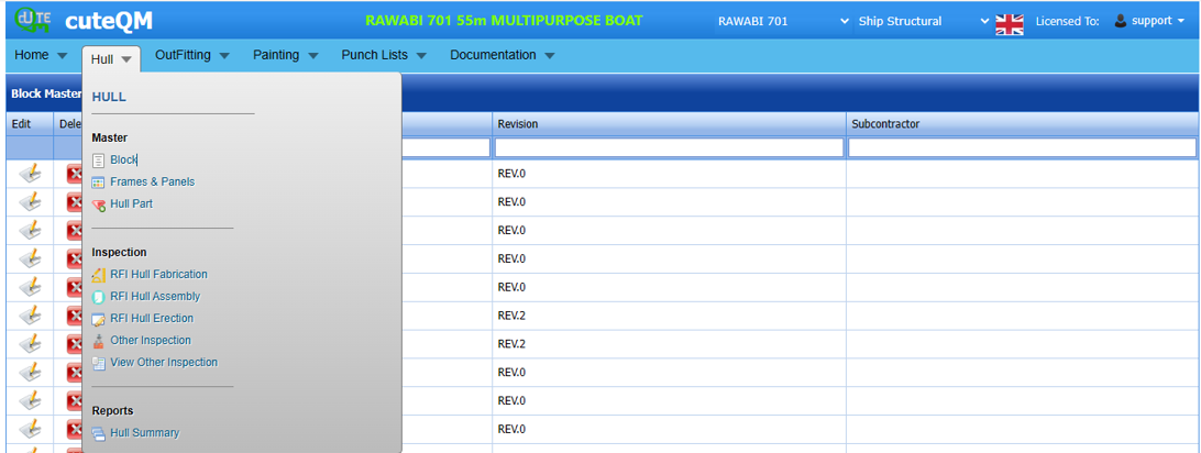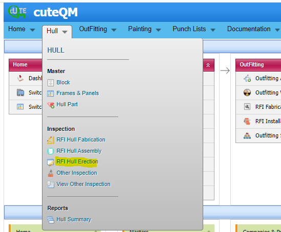 The Hull menu in the cuteQM app helps you to add the master data. Once you click the Hull menu, the following tabs open, Master, Inspection, and Reports.