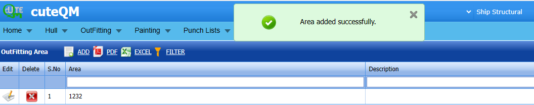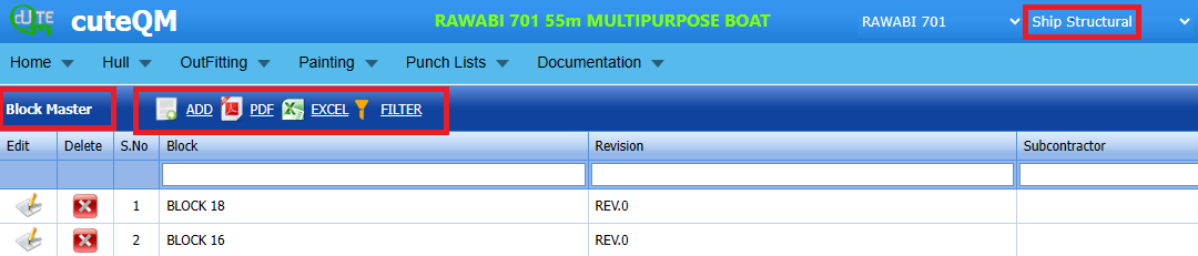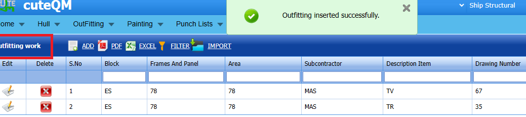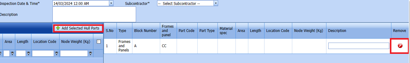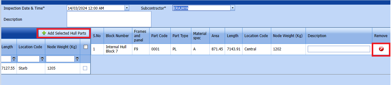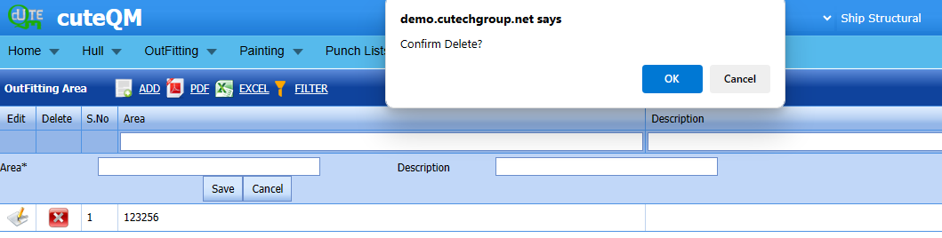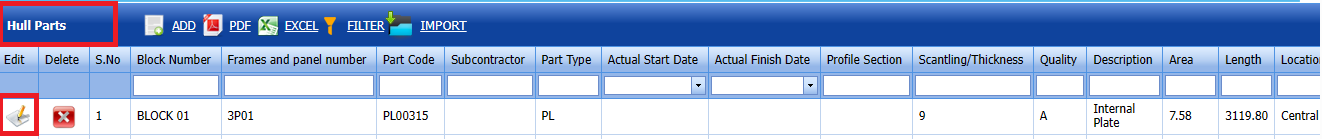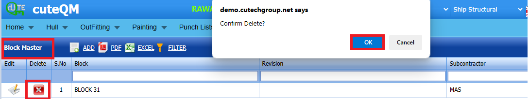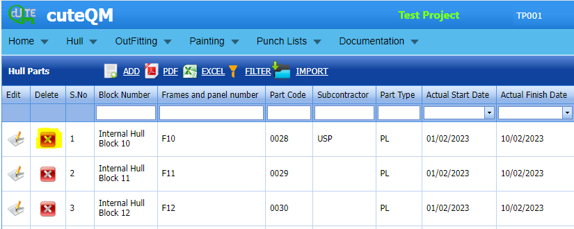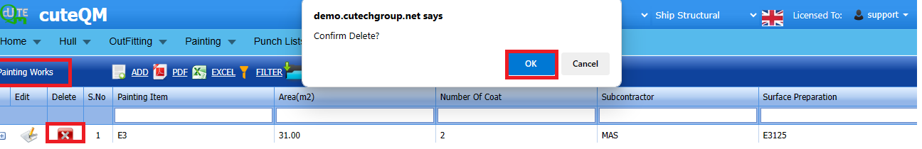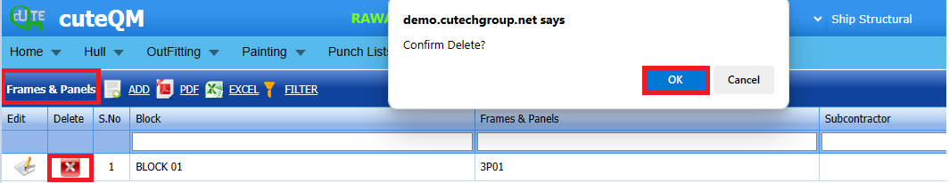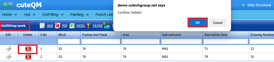 (Delete icon) provided in the Hull Parts page. By click confirm delete