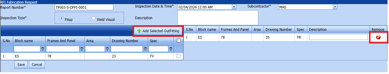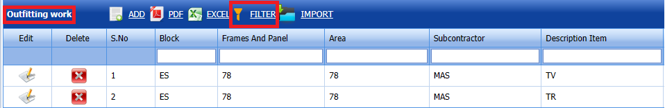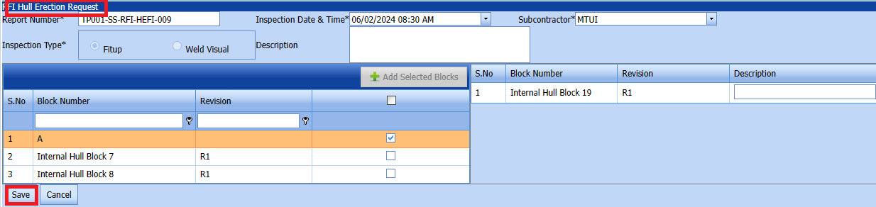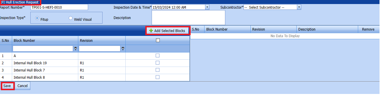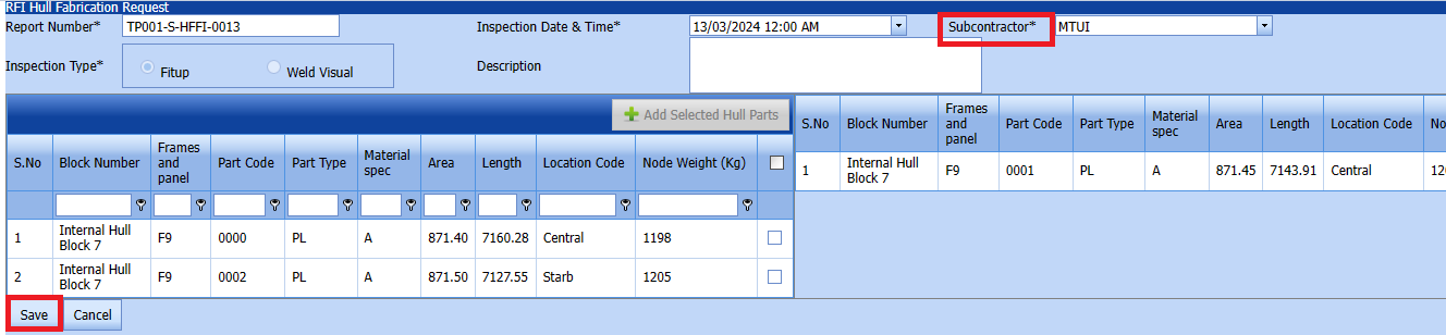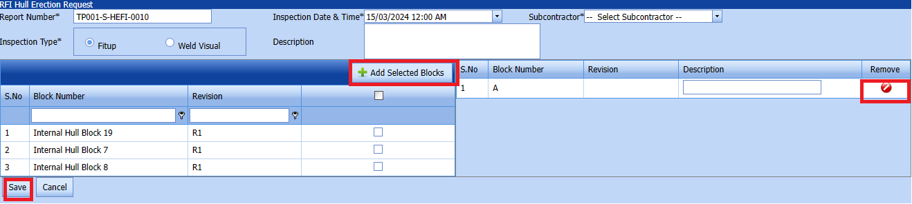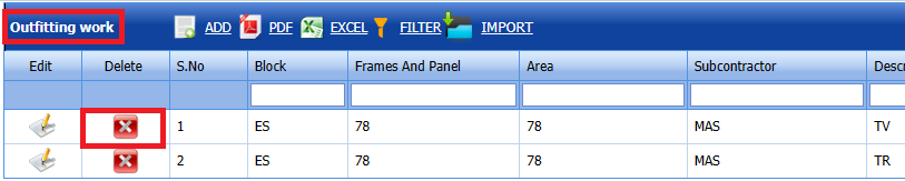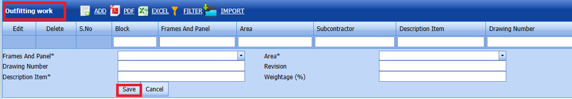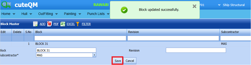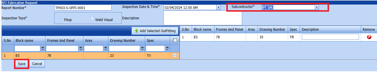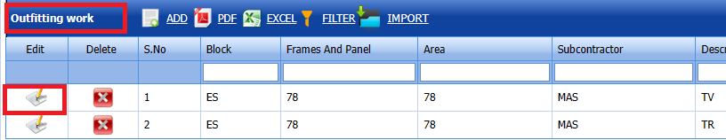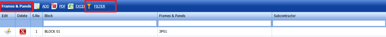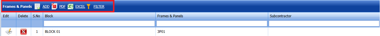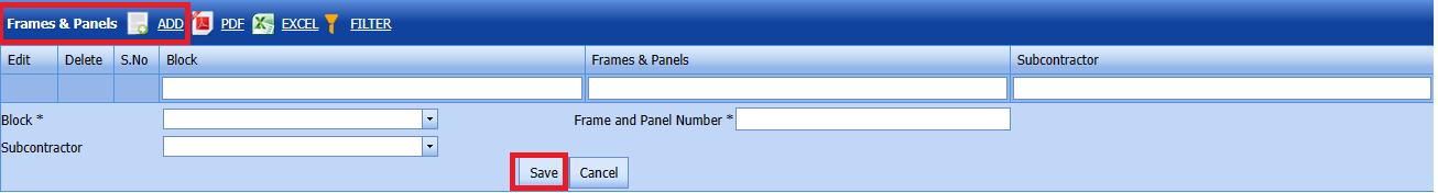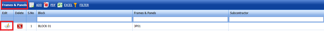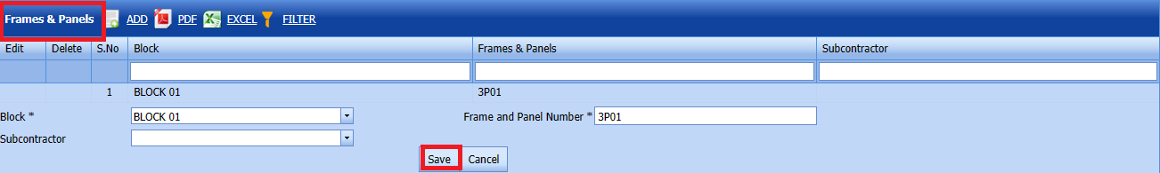 Edit the details of Block no,Frames and panel no and Subcontractor as required.
