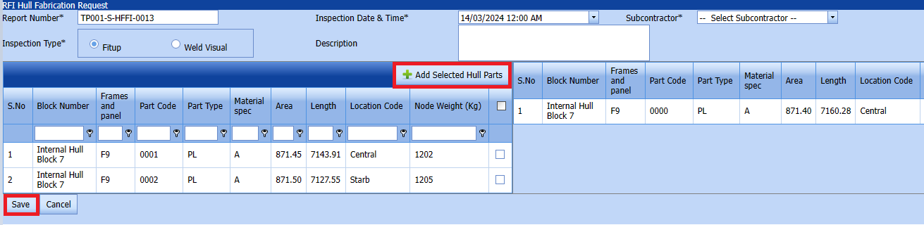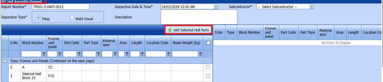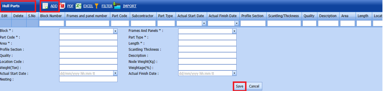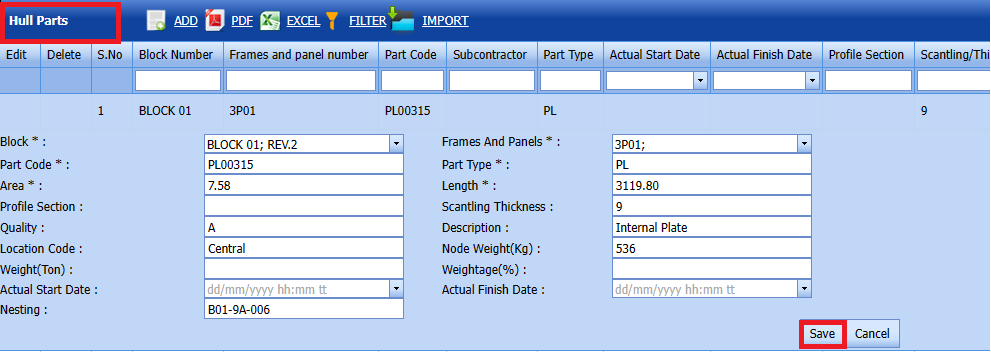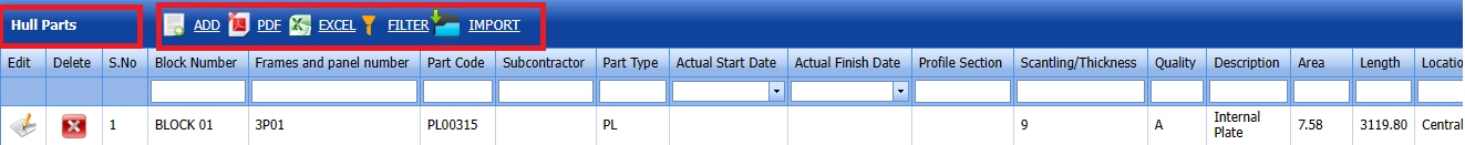 The Hull Parts tab in the Hull menu helps you to add the details of Hull Parts to be in used in the Ship structural. If you want to navigate to Hull Parts,