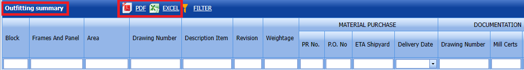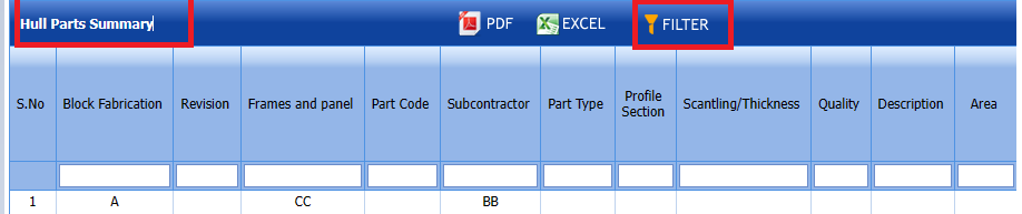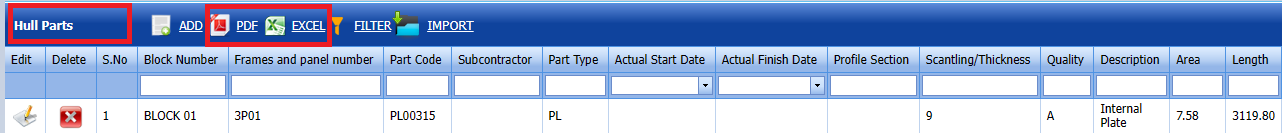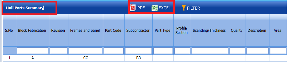You can export a list of Hull added in the Hull Part page in both the pdf and excel formats by using