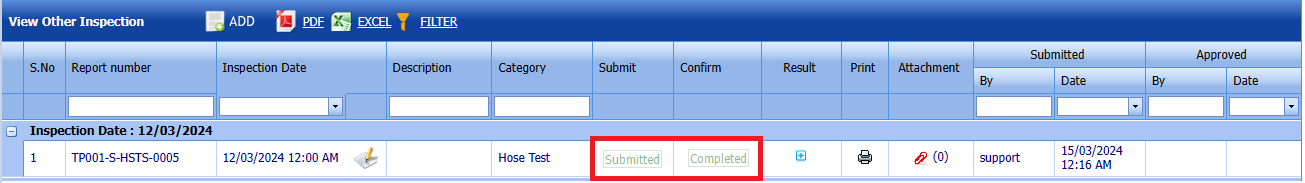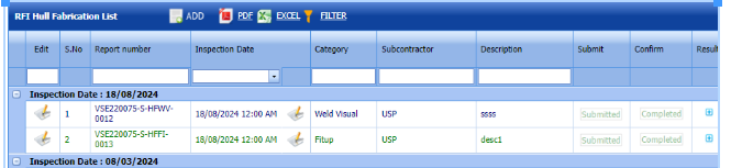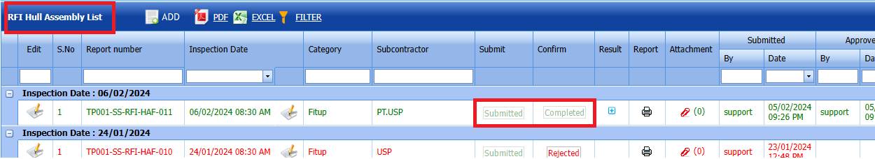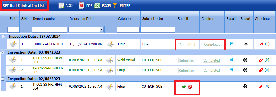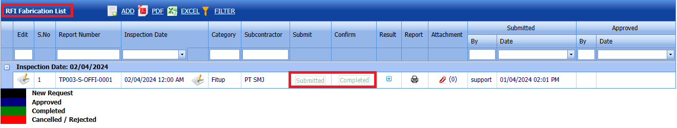 Once you have submitted the RFI Coat Inspection request, in the Confirm Status column in the RFI coat inspection request List page is appeared with