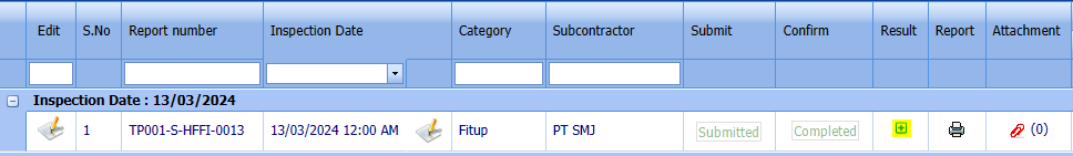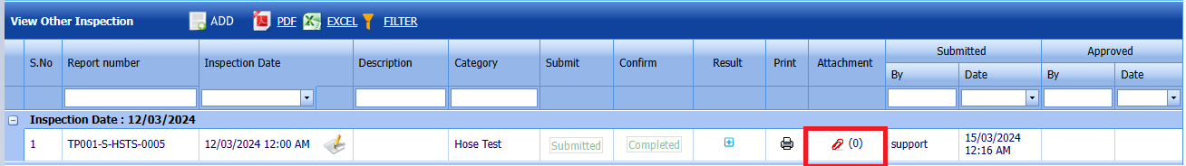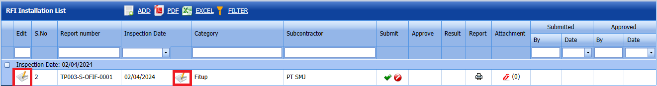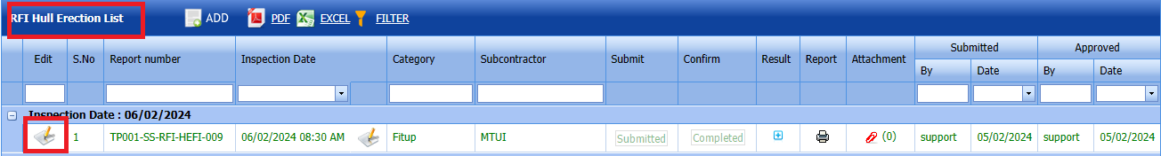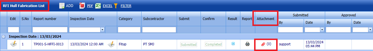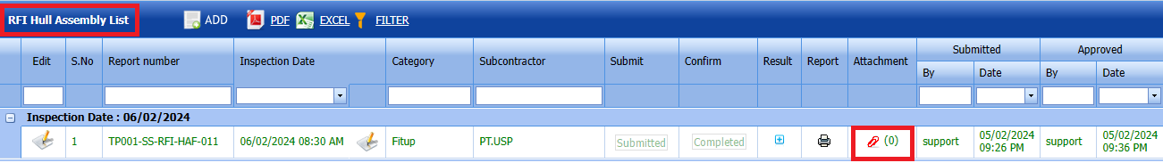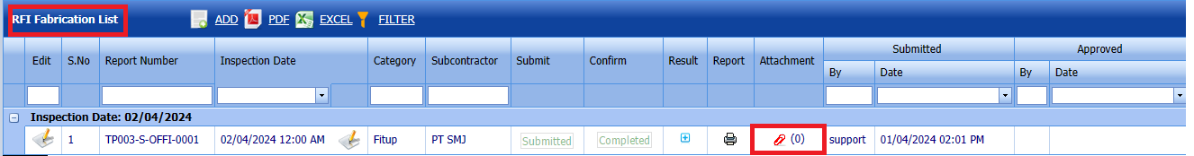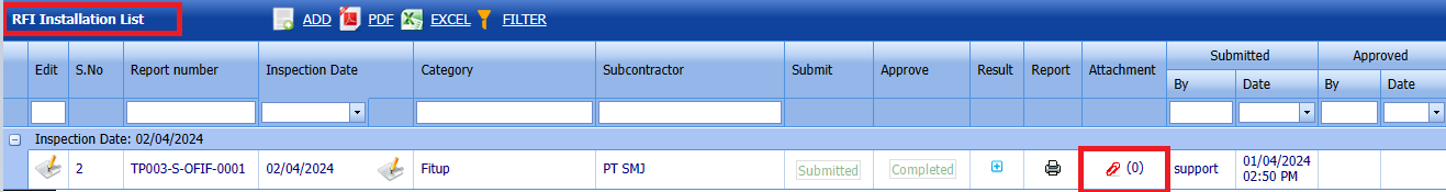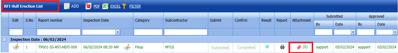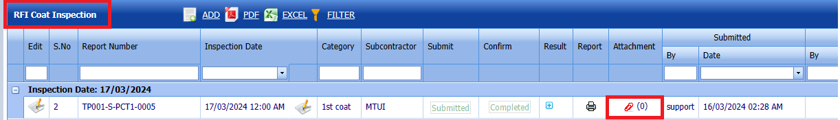 If you want to attach a file with any existing RFI Coat inspection list listed in the RFI Coat inspection List page, you can attach the file by using