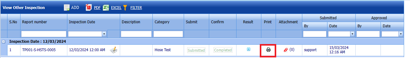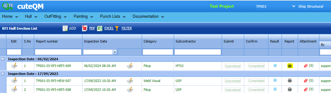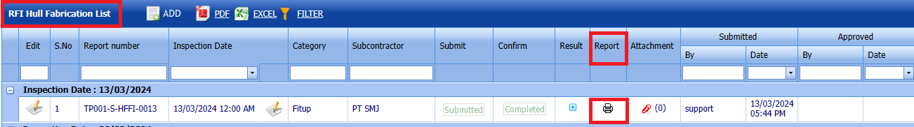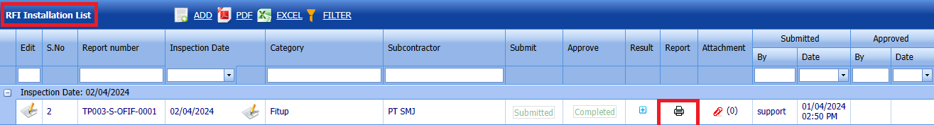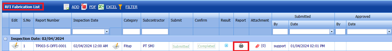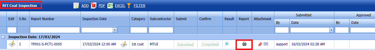 (print icon) provided in the Report column of the RFI Coat Inspection List