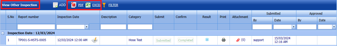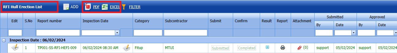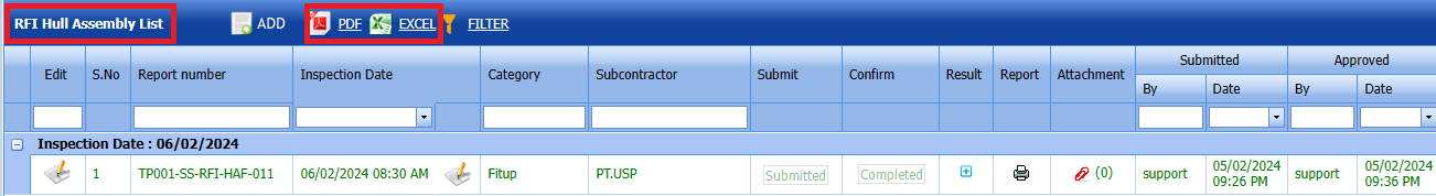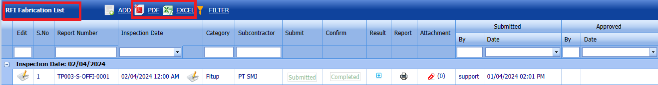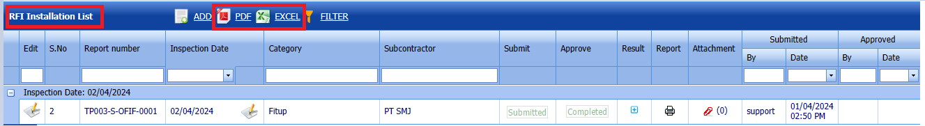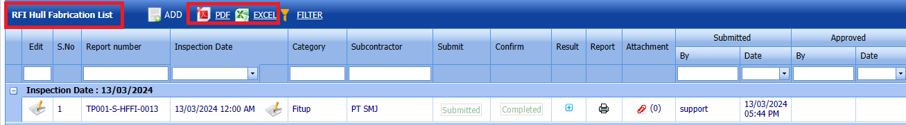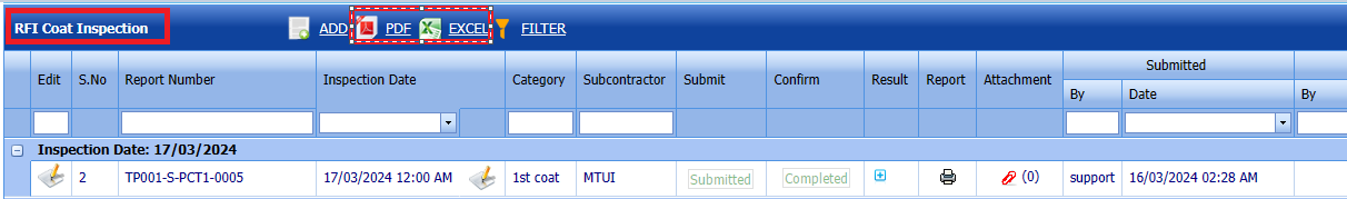You can export a list of RFI Coat Inspection requests added in the RFI Fit coat Inspection page in both the pdf and excel formats by using