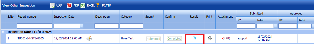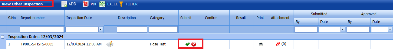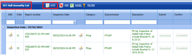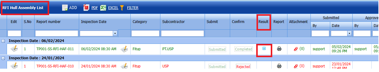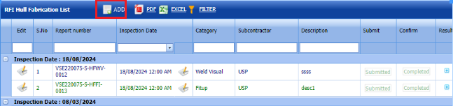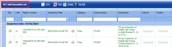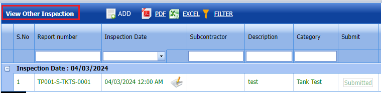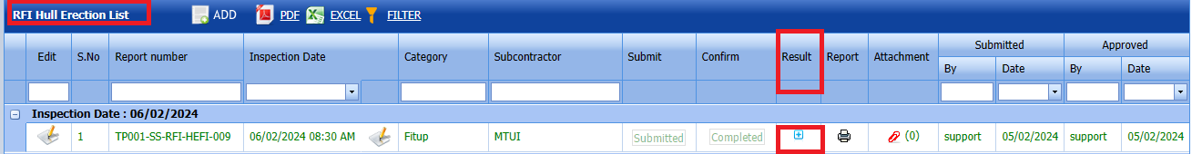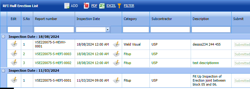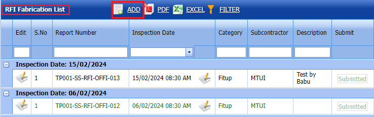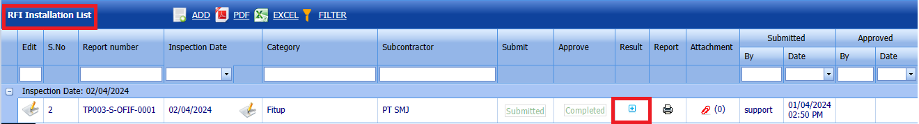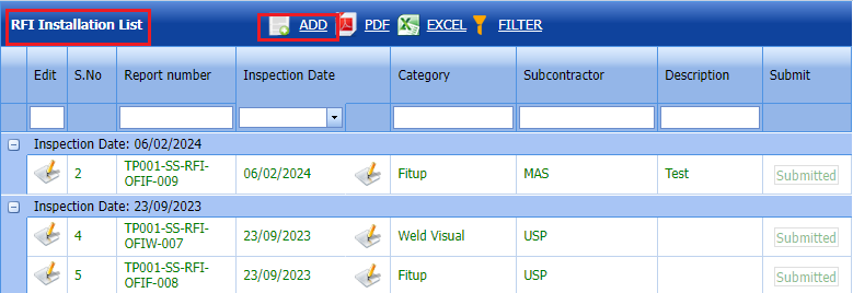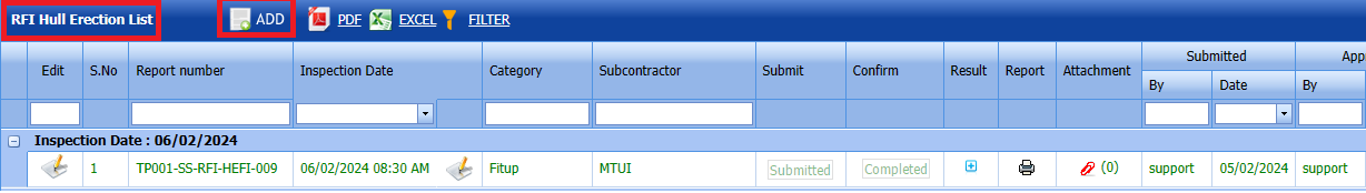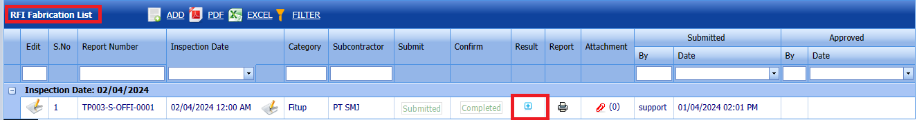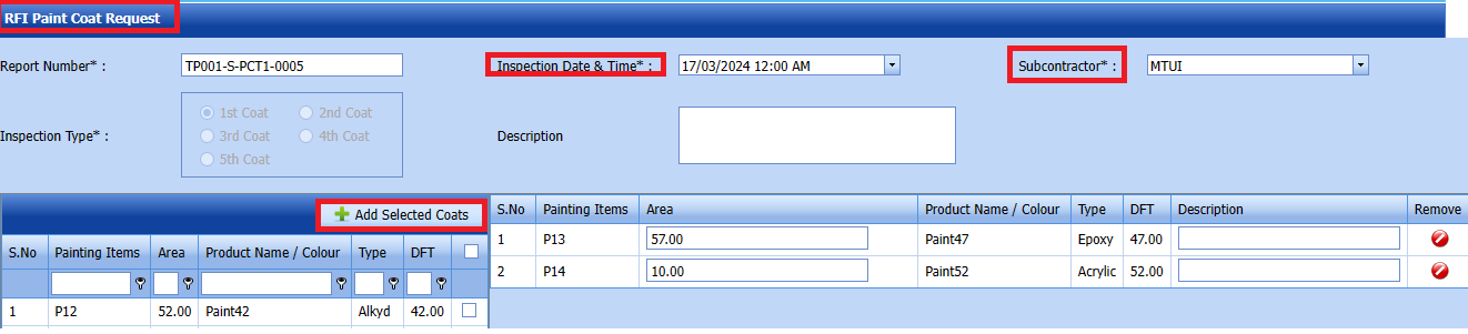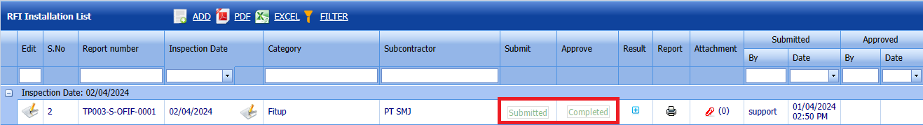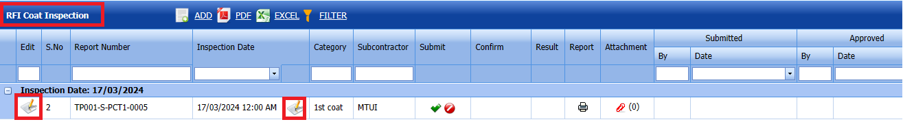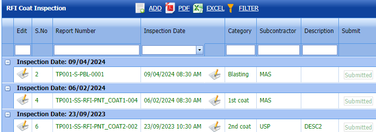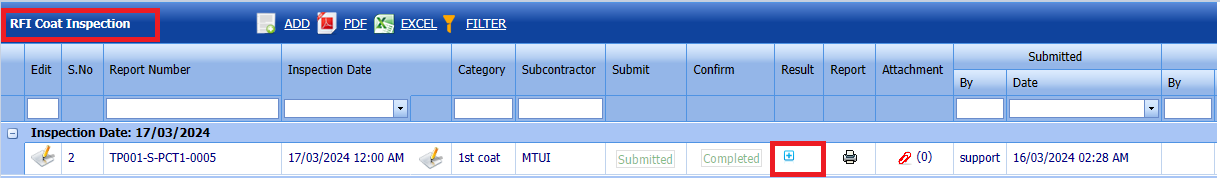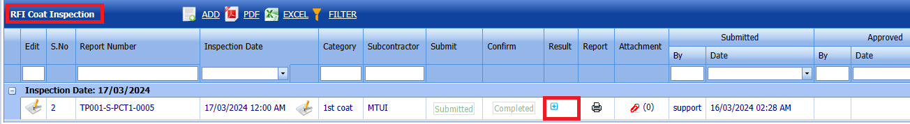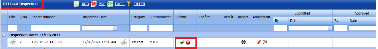 Once you have added the RFI Coat inspection request, the Submission column in the RFI Coat inspection page is appeared with