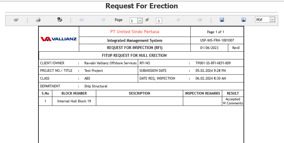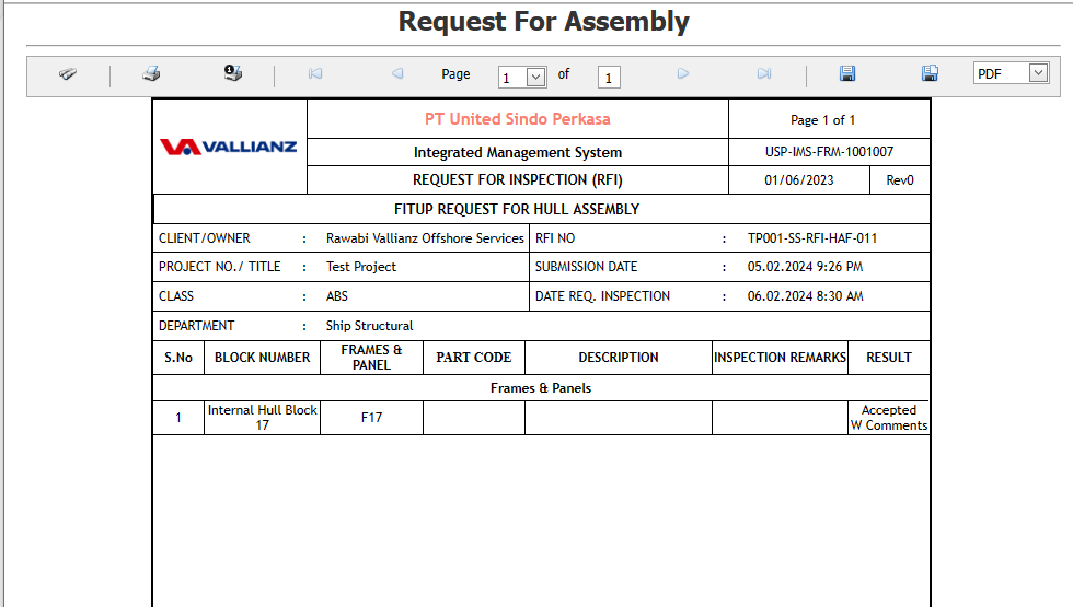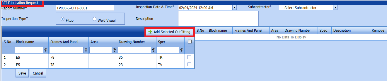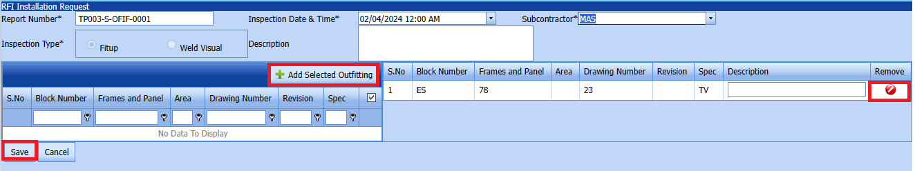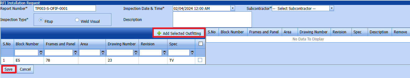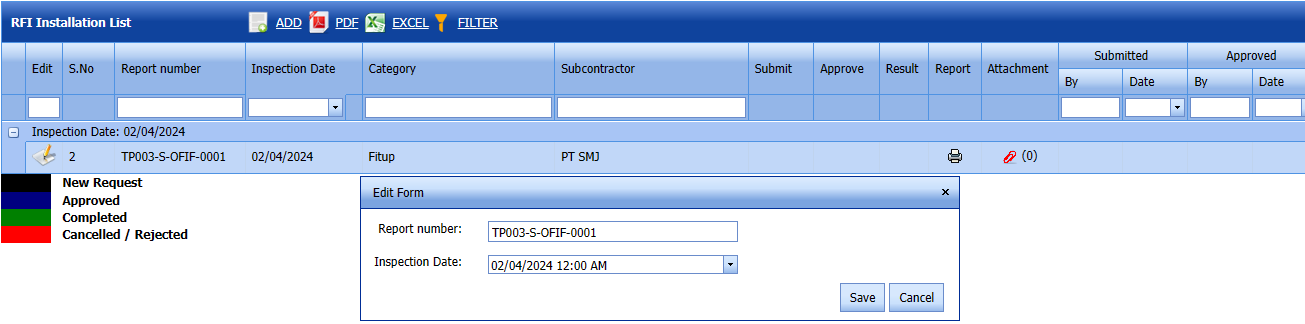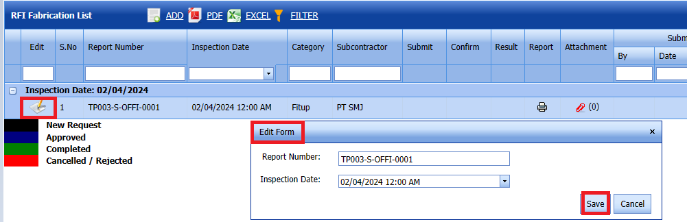Fig 5.2.4 Approve RFI Inspection Page - Click Save