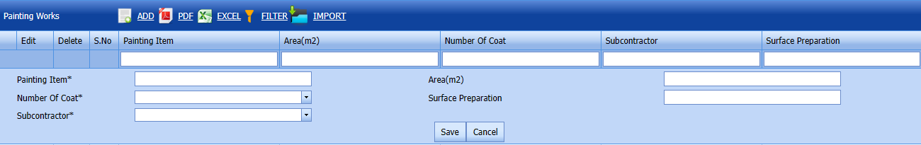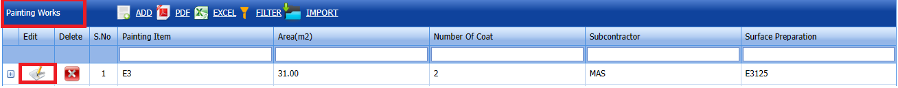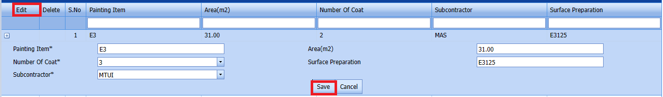 Edit the details of Painting item,area,Number of coat,surface preperation and subcontractor as required.