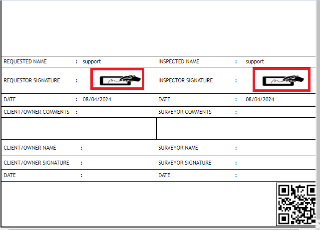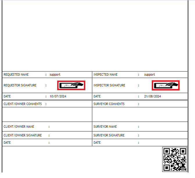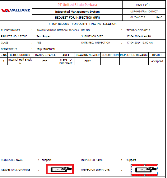 Signature of production user and QC also shown in the print. Requestor signature mapped with Production user and Inspector signature mapped with QC .