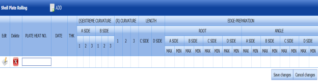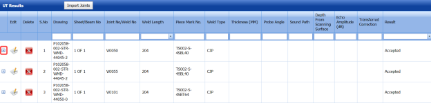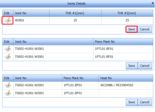 (Edit icon) in the Edit column for the respective joint numbers of the columns where you want to make changes in the thickness of the weld joint, piece mark number, and heat number. -