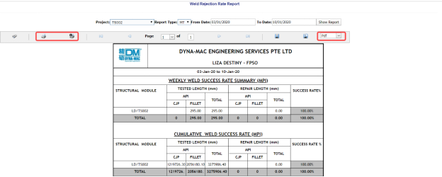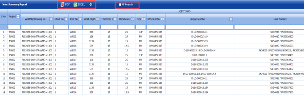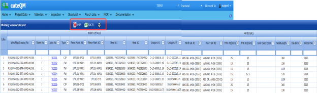 You can export a list of welding summary reports added in the Welding Summary Report page in the pdf and excel formats. To know how to export, see the topic, “Export Areas list” in the Area option.