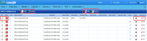You can export a list of weld traceability record added in the Weld Traceability Record page in the pdf and excel formats. To know how to export, see the topic, “Export Areas list” in the Area option.