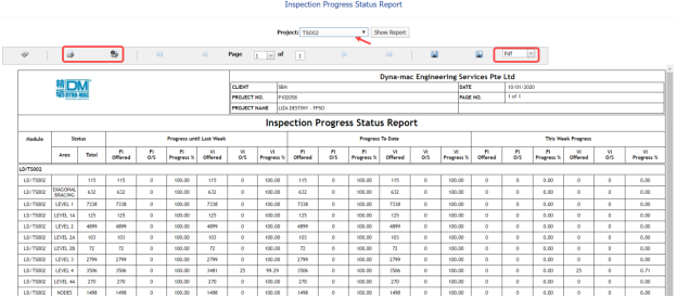 You can export the inspection progress status report in the Inspection Progress Status Report page in various formats by using the option