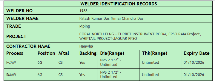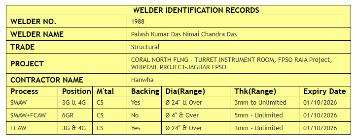 If you scan the QR code in the welder pass on your mobile, the system will show the scanned welder's current valid qualifications. Because the welder pass might be printed & issued to the welder some months before. Suppose if the client representative wants to check the welder's current valid qualification in the welding yard, just scan and check, and there is no need to call the welder's pass-issued person or coordinator to check.
